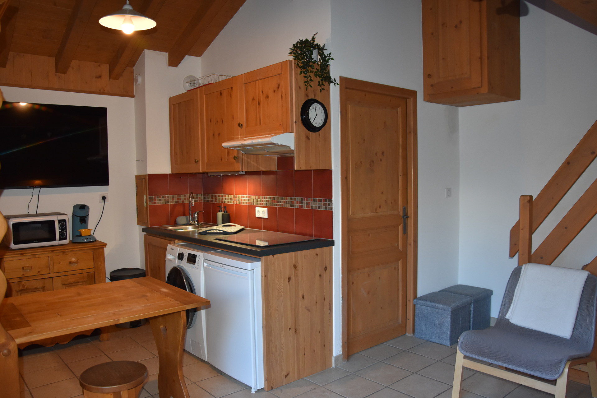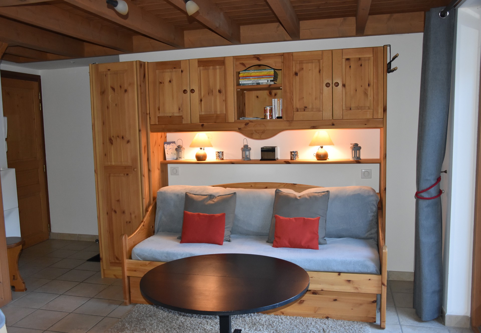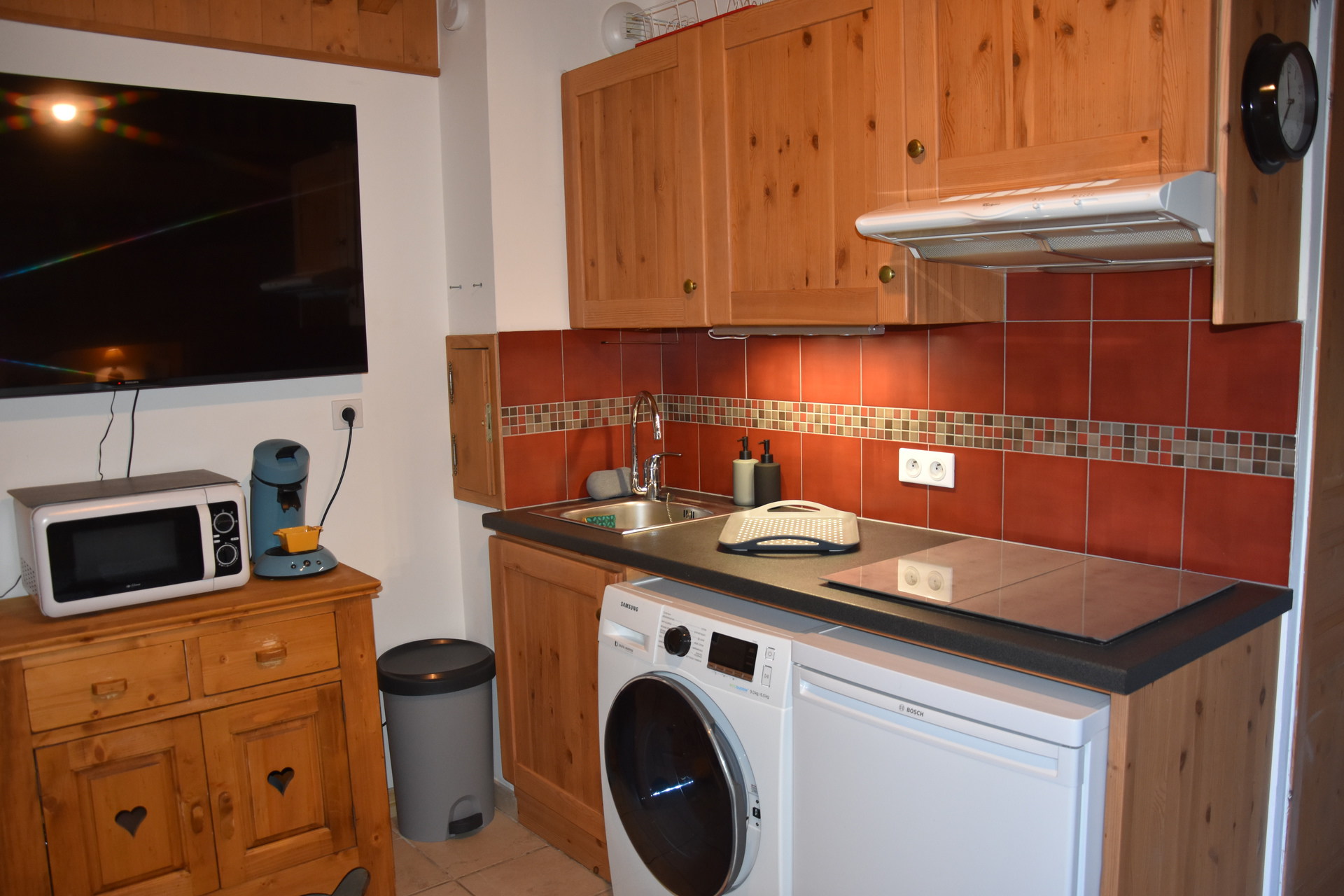 Séjour/cuisine (micro-ondes, frigo, lave-linge/séchant, plaque induction) et banquette-gigogne, (télévision).