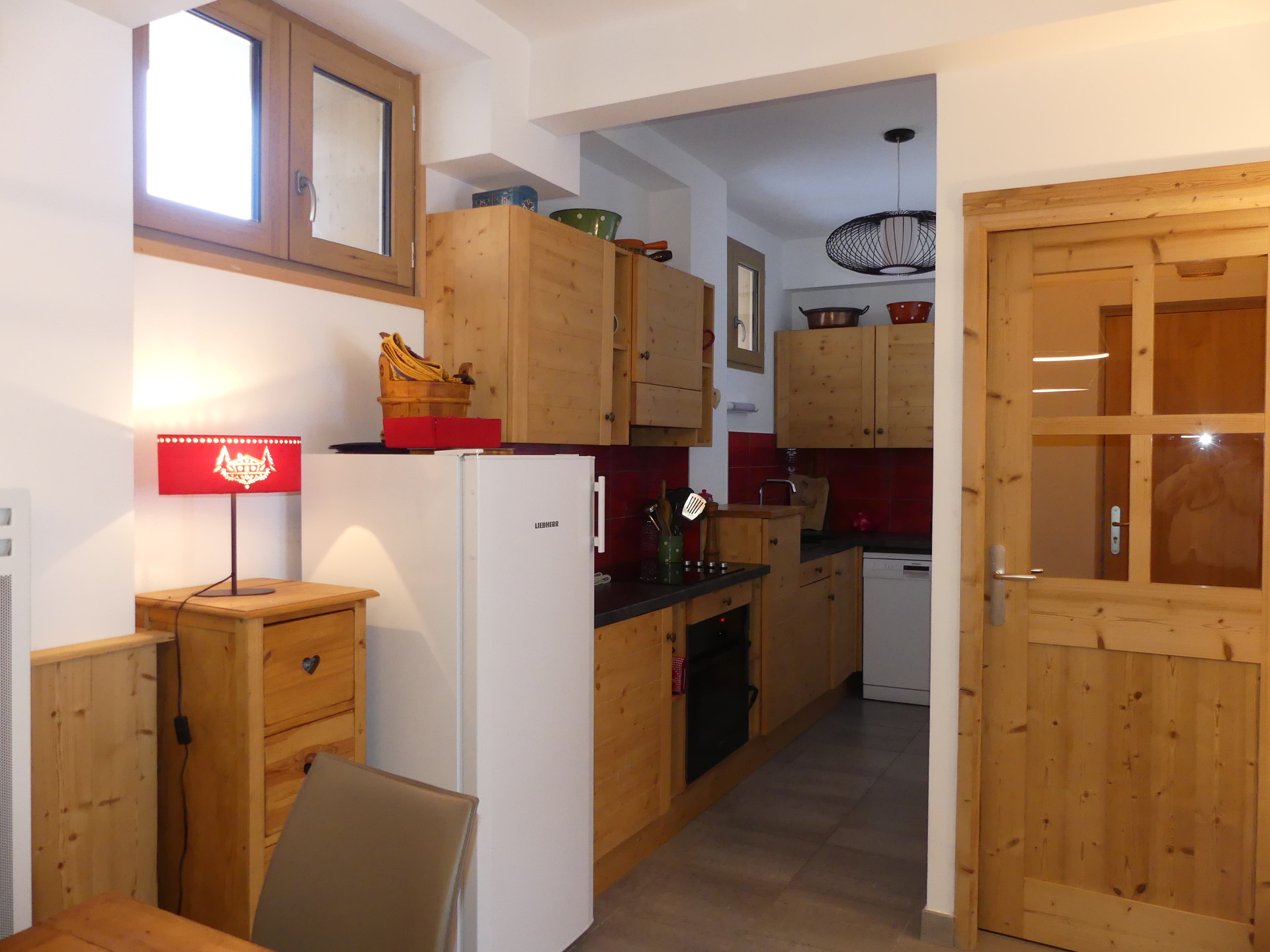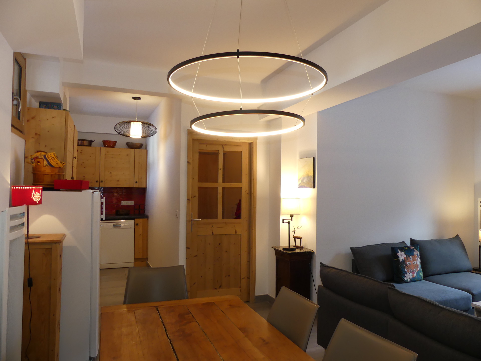 CUISINE-SALLE A MANGER avec lave-vaisselle, four, plaque vitrocéramique, hotte, réfrigérateur, cafetière, grille-pain, bouilloire.
