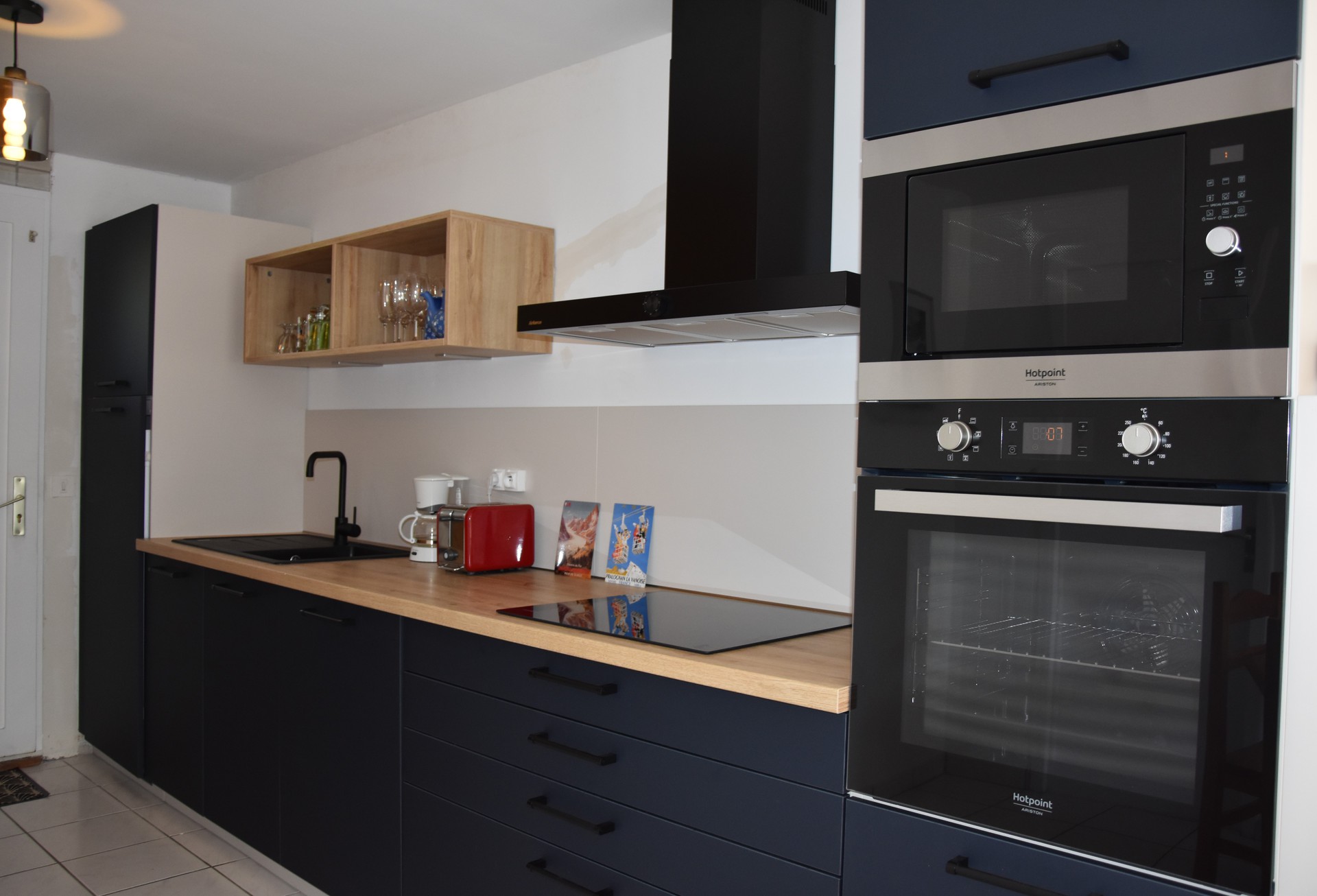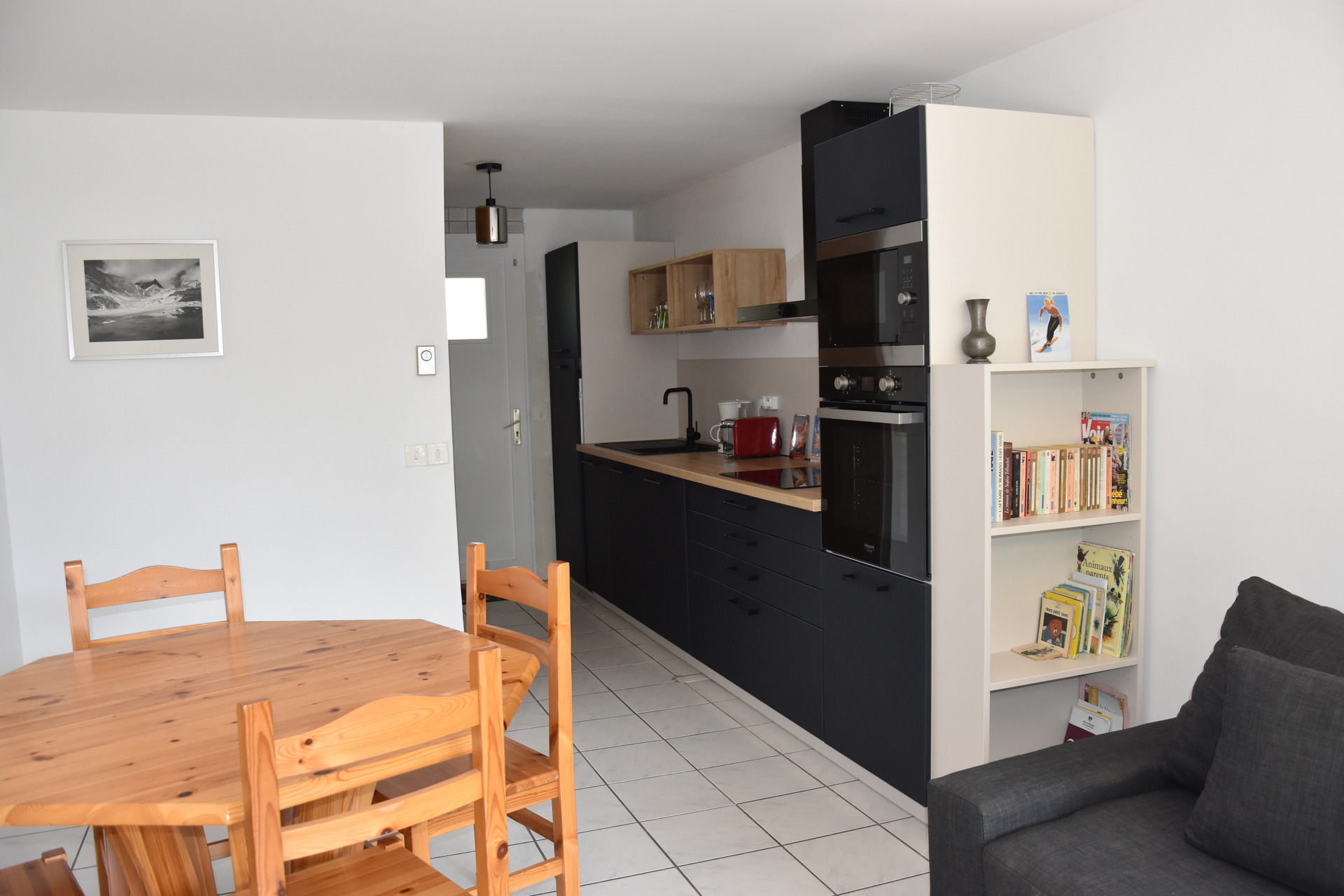 Séjour/cuisine (four, micro-onde, frigo, lave-vaisselle, plaque vitrocéramique), canapé (télévision).
