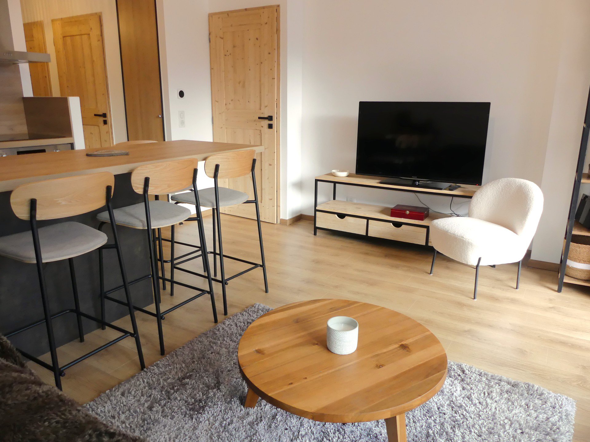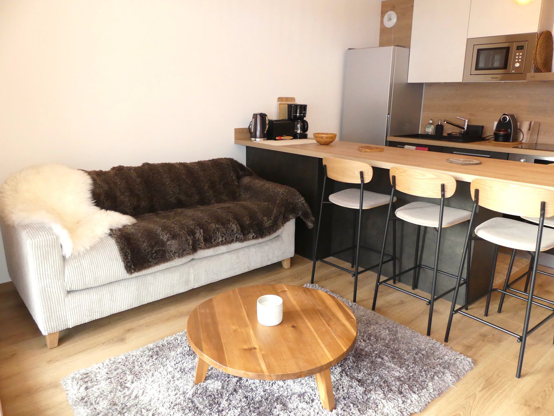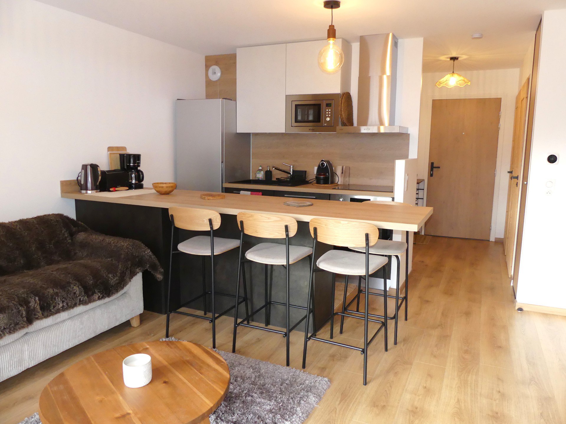COIN CUISINE avec lave-vaisselle, four traditionnel, micro-ondes, plaque induction 3 feux, hotte, réfrigérateur, congélateur, cafetière flitre et Nespresso, bouilloire, grille-pain, service à raclette, service à fondue, barbecue électrique.