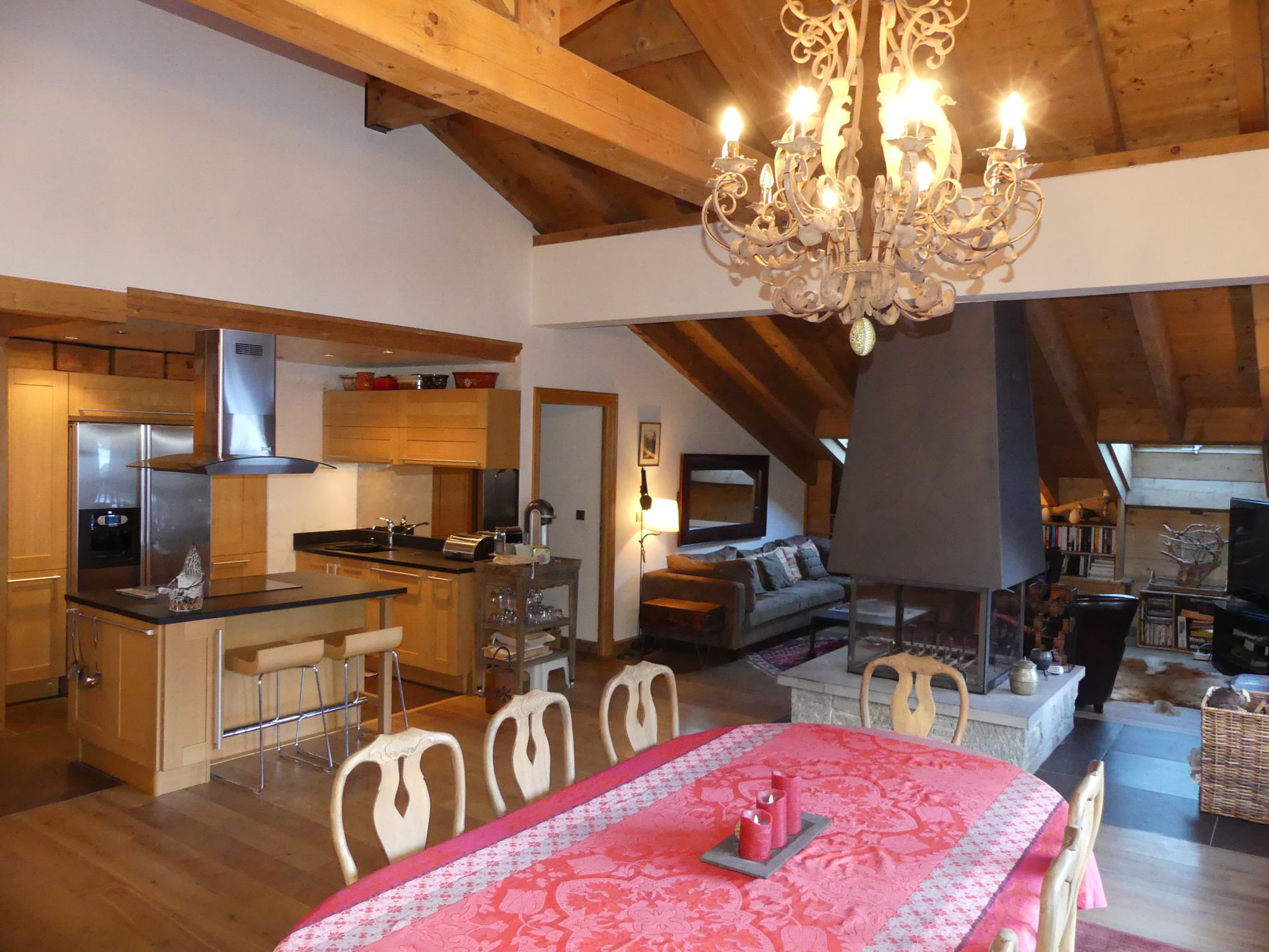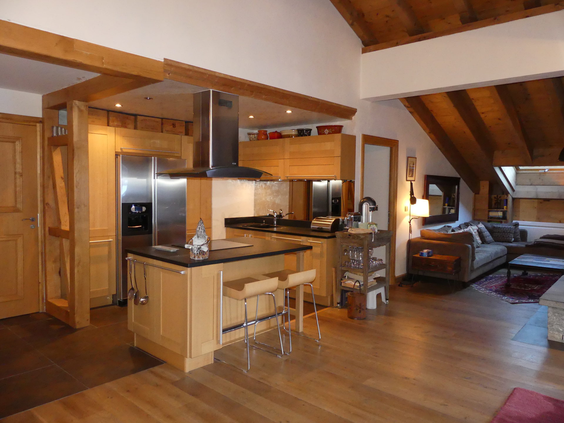 CUISINE EQUIPEE avec lave-vaisselle, four, micro-ondes, plaque induction 4 feux, réfrigérateur, congélateur, hotte, bouilloire, cafetière Nespresso, service à raclette / fondue, grille pain.