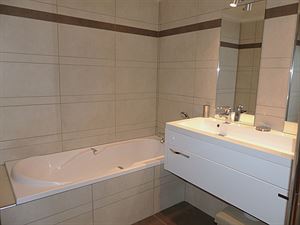 CHAMBRE 1 avec 1 lit double en 160 et salle de bains comprenant une douche, une baignoire et WC. Balcon exposé est.