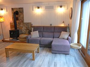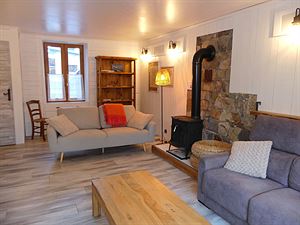 SEJOUR avec deux canapés (télévision) et accès sur la terrasse et le jardin. (interdiction d'utiliser le poêle à bois, DANGER)