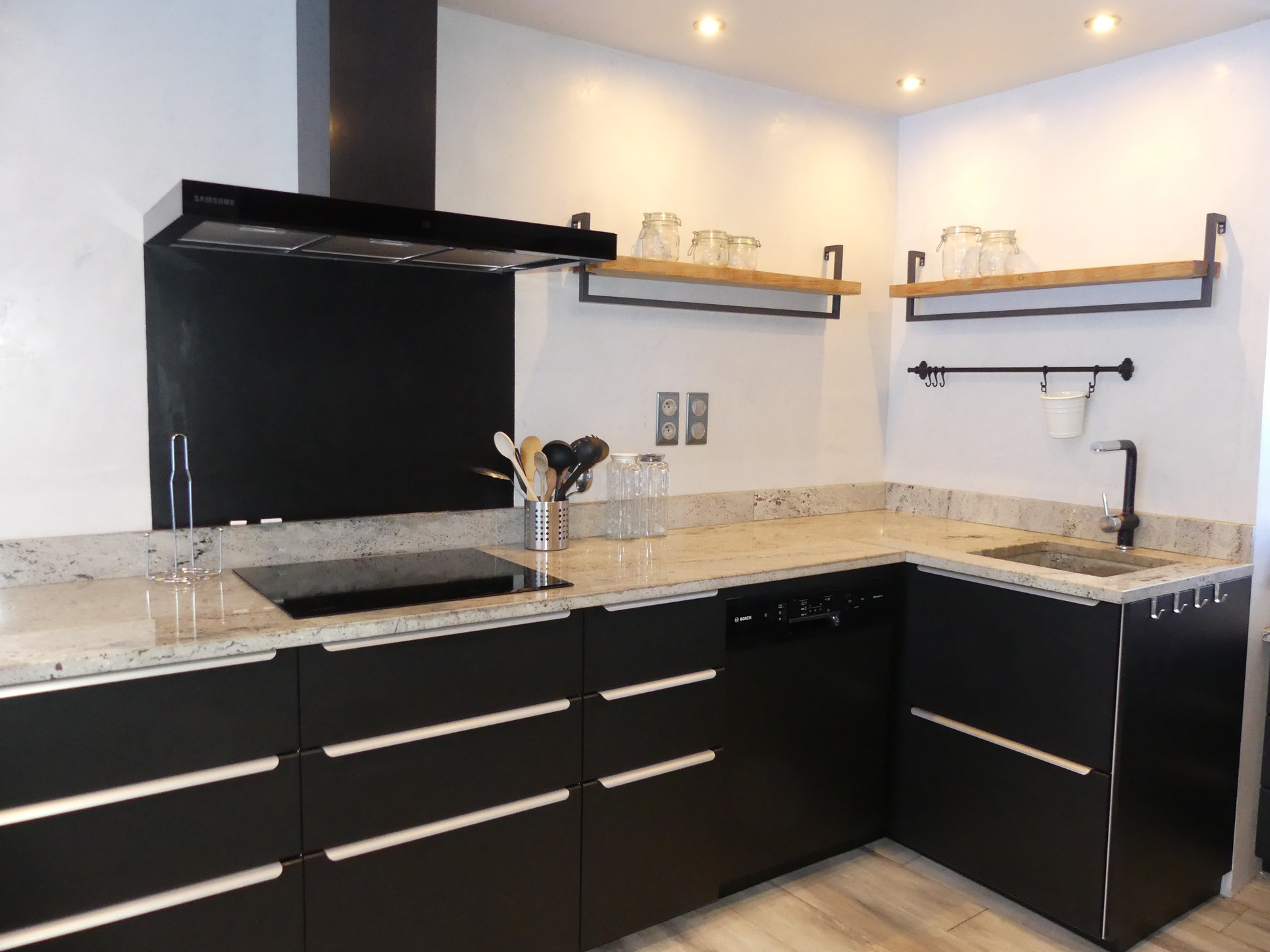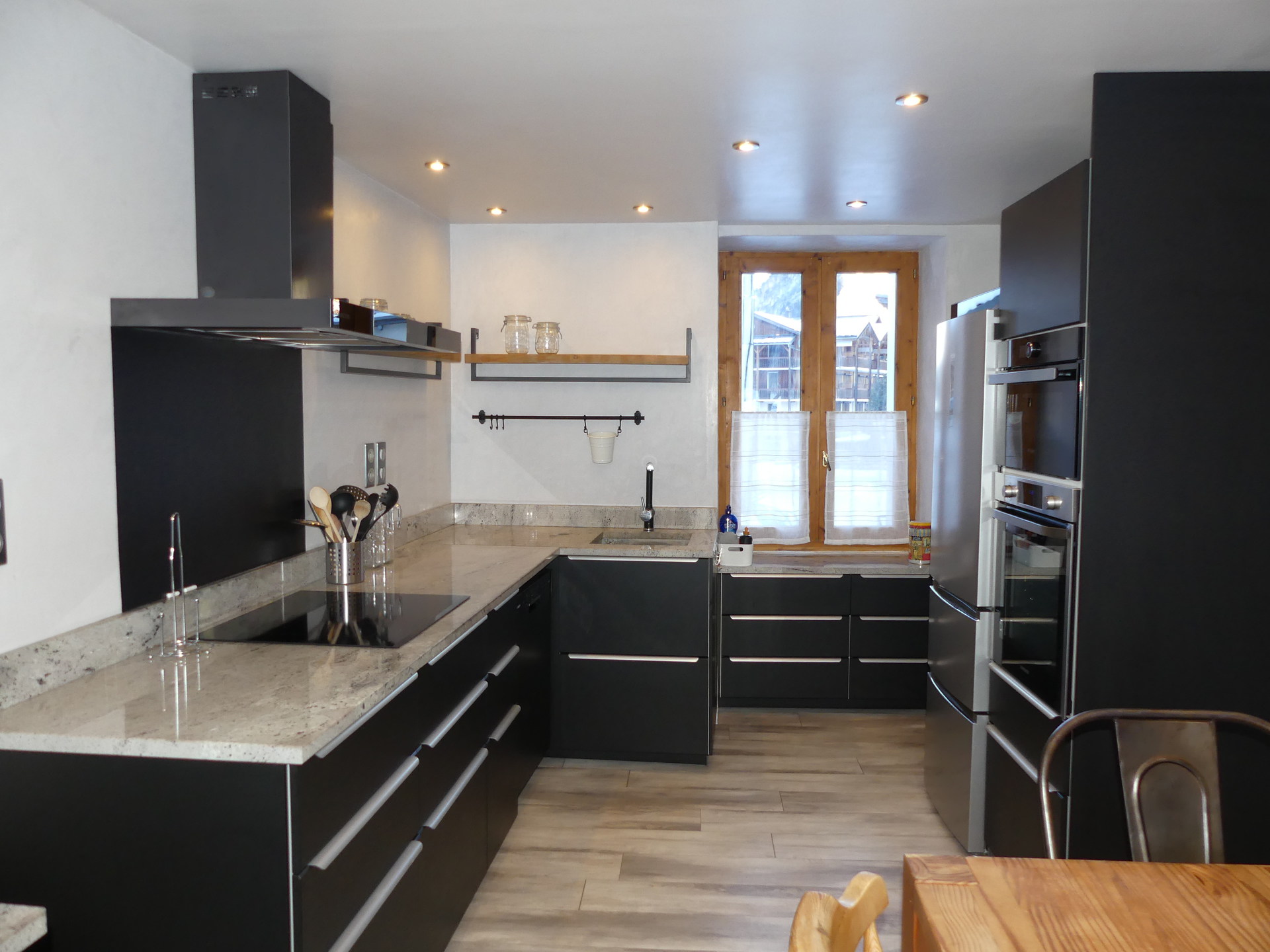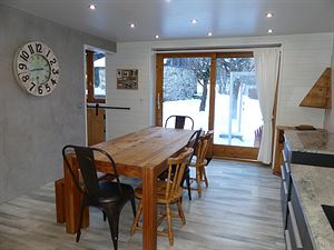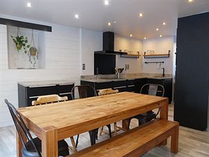 CUISINE avec table à manger, lave-vaisselle, four, micro-ondes, plaque induction 3 feux, hotte, réfrigérateur + partie congélateur, cafetière, grille-pain, bouilloire, appareil à raclette, appareil à fondue, mixeur, batteur. Accès à la terrasse et le jardin par la baie vitrée.