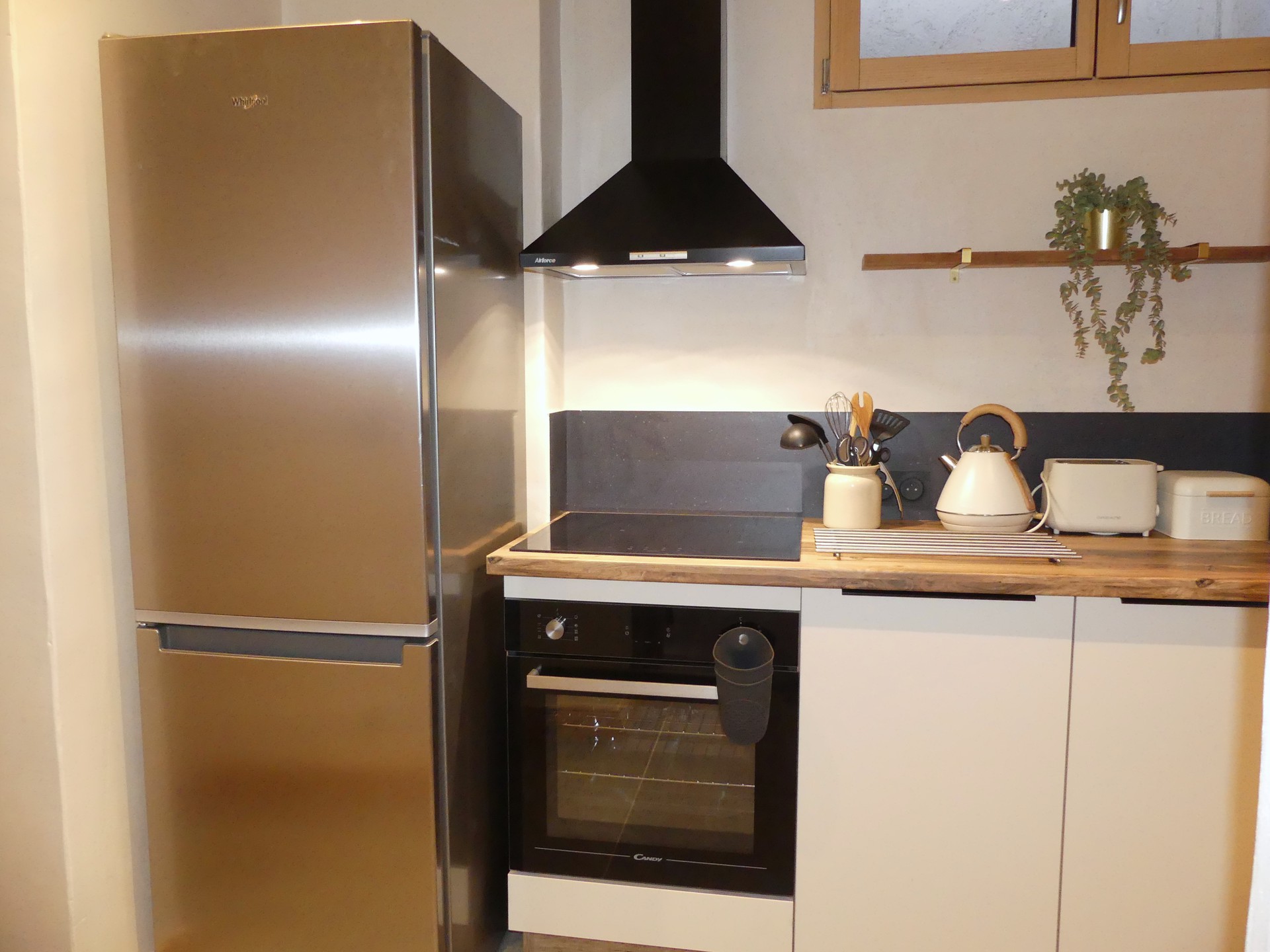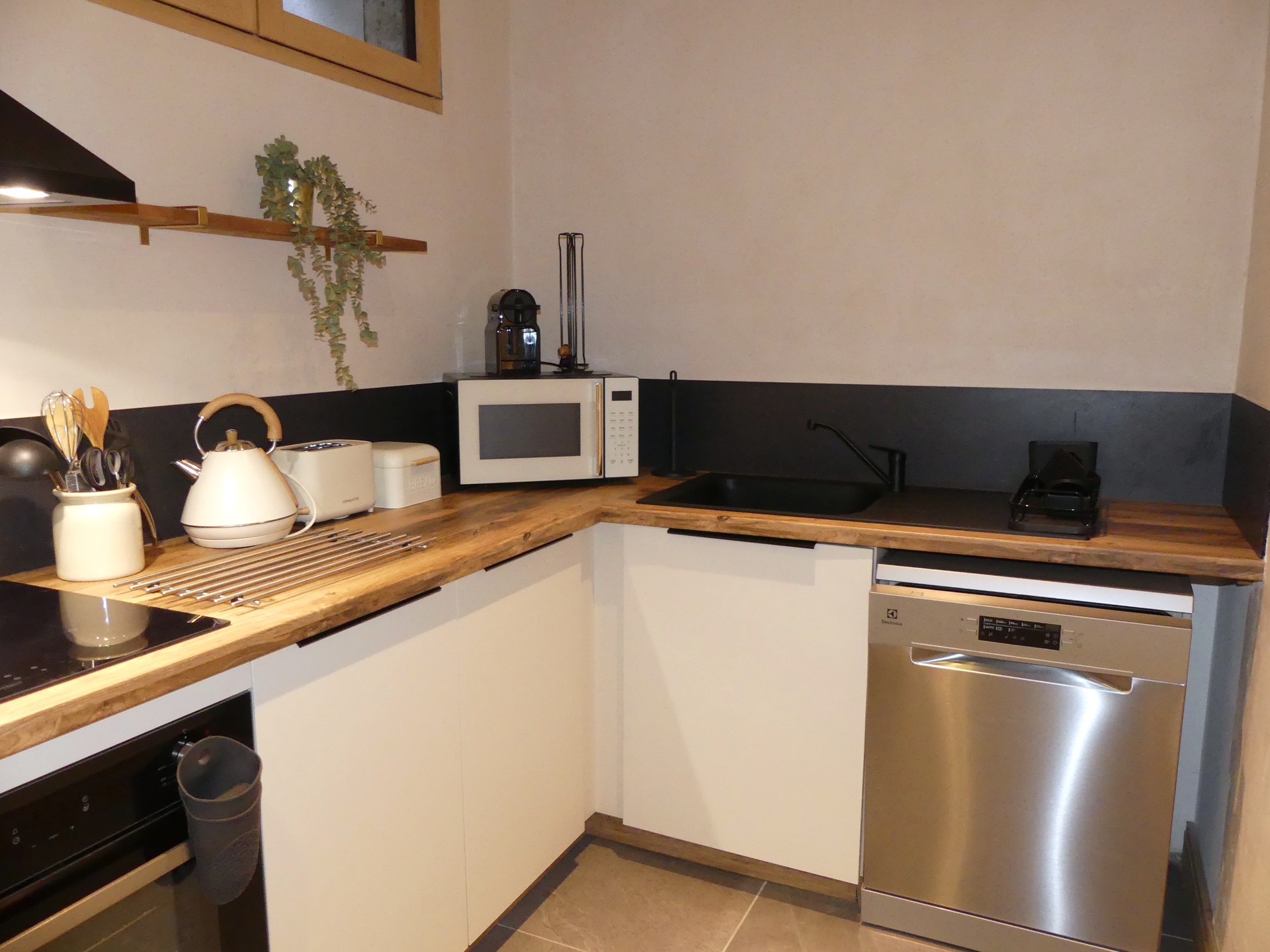 CUISINE équipée avec plaques induction 3 feux, hotte, four, micro-ondes, refrigérateur, lave vaiselle, cafétière Nespresso, bouilloire, grille pain, appareil à raclette.