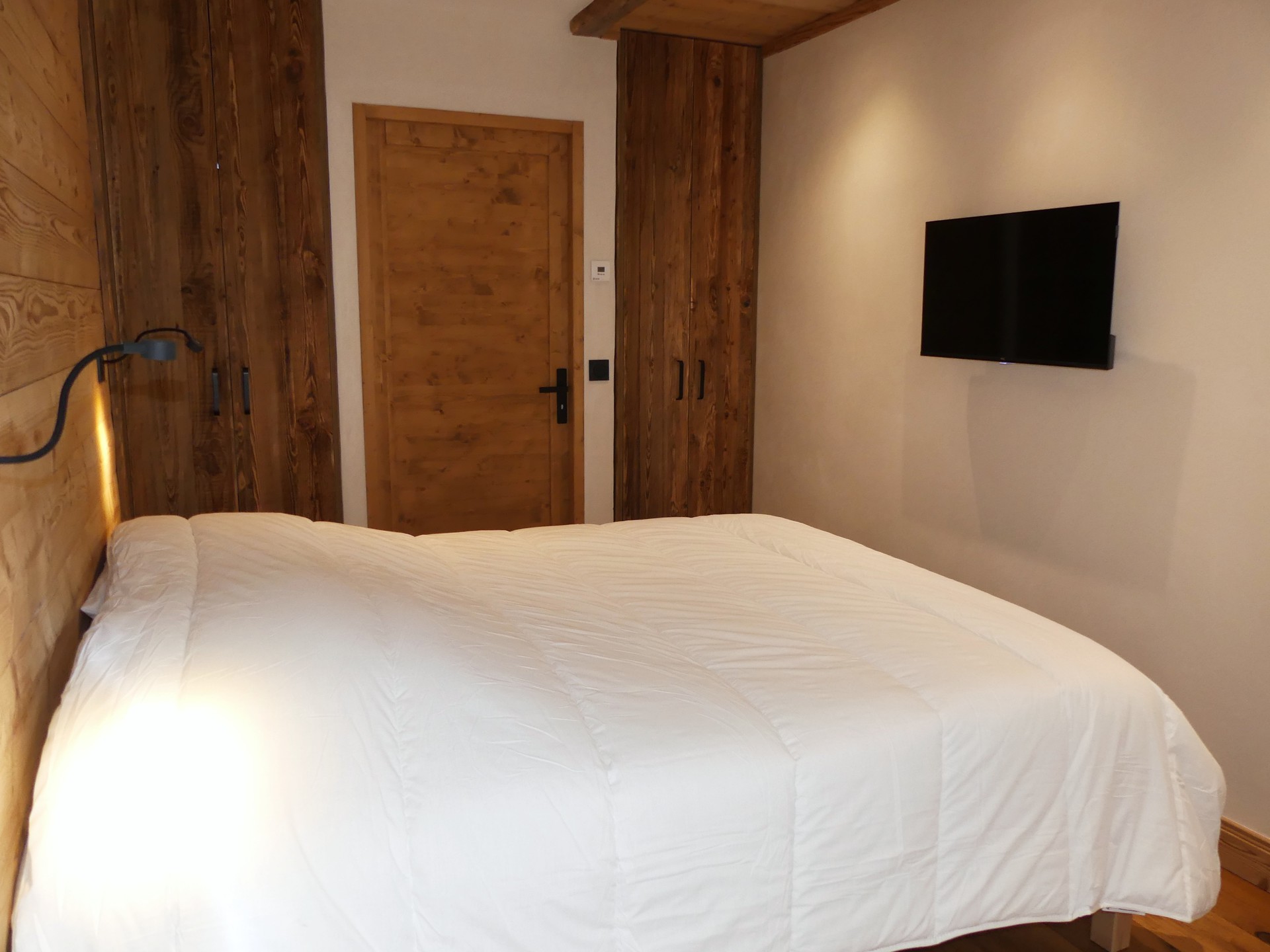 CHAMBRE 1 avec 1 lit double en 140 et rangement avec accès à la terrasse.